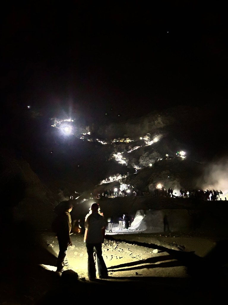 Eens je dan aan de top bent (in de pikkendonker nog steeds) start de afdaling naar beneden, naar het blauwe vuur. Dit ontvlamt door de pijpen van de zwavelwerkers, want die zijn ook al hard aan het werk. Deze verdienen naar mijn mening veel te weinig voor al hun harde werk zo’n 1000 IDR (= 5 cent) voor 1 kg (!).